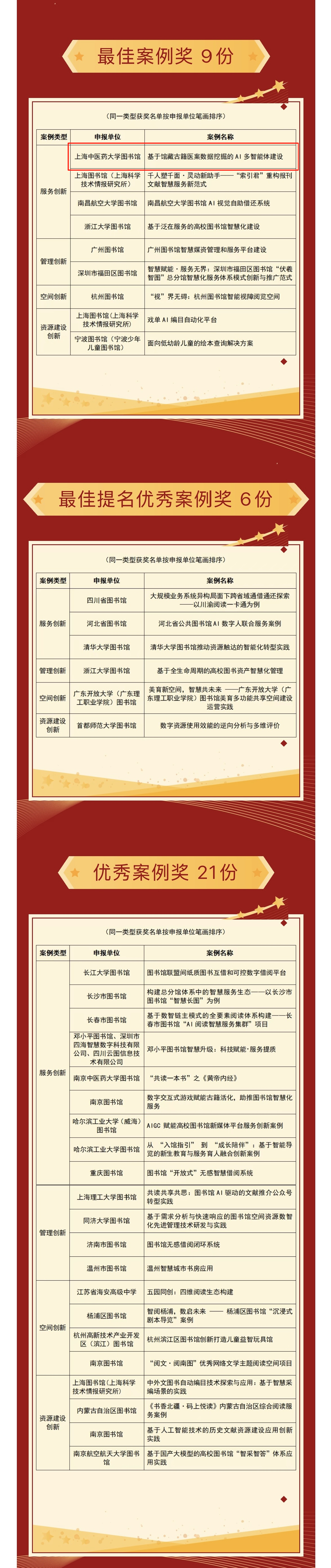 活动共遴选出上海中医药大学图书馆、上海图书馆、浙江大学图书馆等各类最佳案例9份;清华大学图书馆、四川省图书馆等最佳提名优秀案例6份,具体获奖名单如下。