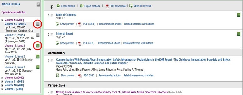 如果下载的文章我馆已购买,请查看该文章的状态是整理中,还是整理完成。以Academic Pediatrics为例。在数据库中搜索此期刊,点击进去。在左边期刊的Volume列表中,对于整理好的Issue后面的图标是绿色的,点击进去,里面的文章都可以下载。如果没整理好,图标是灰色,只能下载Table of Contents和Editorial Board。